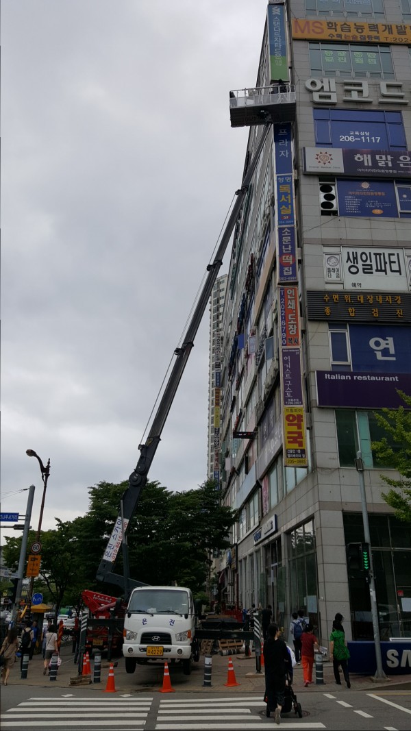 외벽공사,유리공사,간판공사,페인트공사,기타등등 공사벽면에 작업대를 최대한 가까이 밀착 시켜